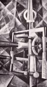 Rectangular or curvilinear forms derived from recognizable architectural or mechanical prototypes; statically contained within the picture frame.