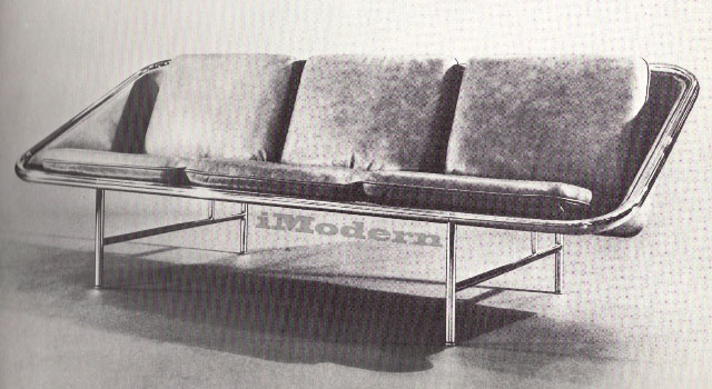The sofa has chromium-plated steel tube legs, and cushions lying on rubber membranes within a round- cornered rectangular framing loop also in tubular steel. There are many aspects of Nelson's design that are especially ingenious. For example, the use of epoxy resin for the final assembly of the frame components. This enables welded elements like the connector between the front and back legs, or the T shaped sections connecting the main loop with its ends, to be mass-produced. The epoxy connection is used to put together elements making up sofas of various lengths, as required.