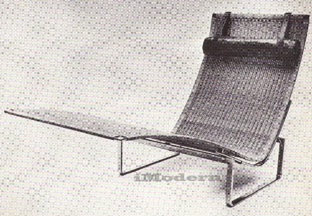 The seat element in this case is fine woven cane on a steel frame. The cylindrical head cushion with straps is again used. Without the slightly superfluous head cushion, Kjaerholm's chaise had a beautifully fine profile. It is comfortable too, though it has a much simpler flat contour, but it is not nearly so stable.