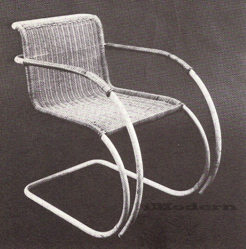 A version of the chair with arms was also made originally, which gave the chair the appearance of a closer connection to the Thonet rocking-chair shape. The arms curved from the back to join the main curve below its outermost point, and they accentuated the airy suppleness of the structure. The armed version seems much less stark, though the arms are unmistakably afterthoughts, and are not entirely satisfactorily connected to the main structure.