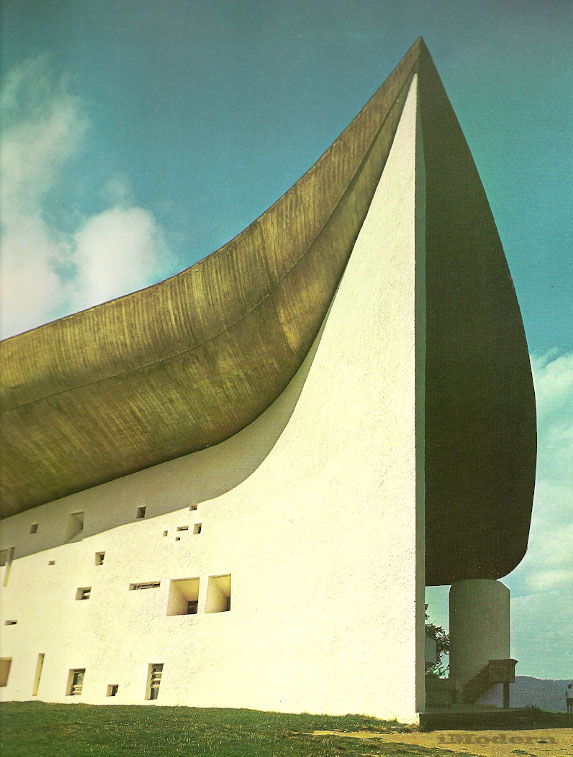 The architecture of Ronchamp seems to the author to be proof of a continuity of patient research, and above all of a plastic vocation. From his very earliest works, even the most stereometrical, the very severe structural arrangement is always softened by a lyrical vein in the contrasting plastic forms. One cannot deny that the roof-top of the Villa Savoye already has latent in it the first and not so timid plastic-formal 'turbulences'.