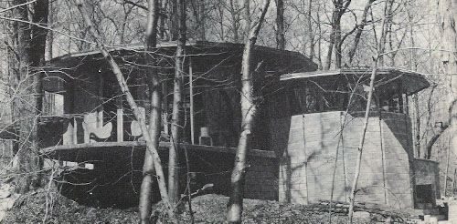 From this central space there are three extensions with curving ends: dining terrace, cantilevered over a brook, opening from one side of living room; kitchen; and a bedroom wing, with its own terrace, which contains master bedroom and study-guest room.