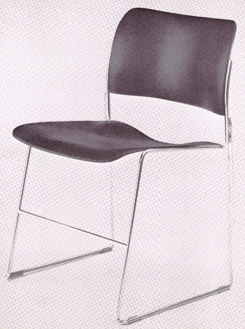 David Rowland set out to tackle the basic criterion for a successful stacking chair, namely closeness of nesting. By using a very thin high-tensile steel rod with a sheet metal seat and back, he achieved a stacking distance of half an inch. This design is an outstandingly good solution to the problem of quantity stacking and storage, and has emerged as both a beautiful and a comfortable chair.